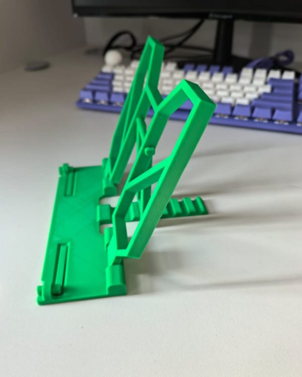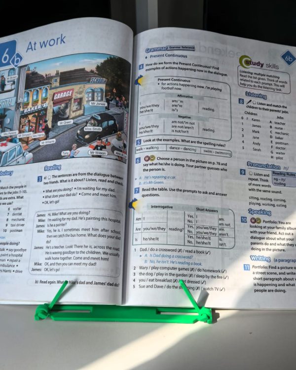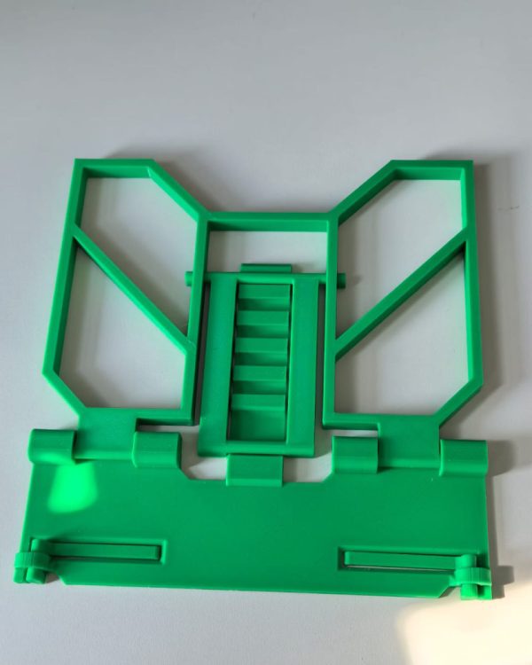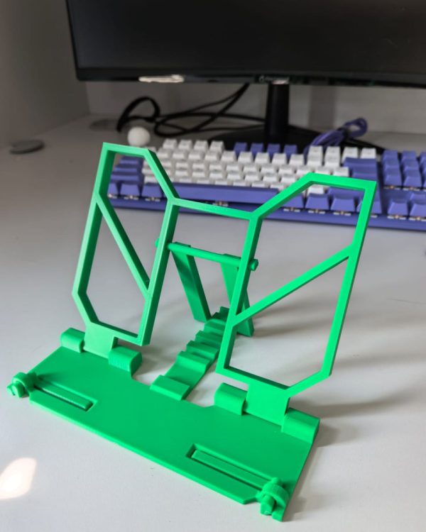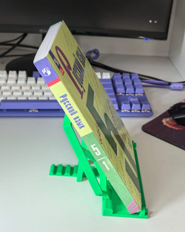Подставка выполнена методом 3D-печати и имеет регулируемый механизм с несколькими уровнями фиксации. Подходит для учебников, рабочих тетрадей, планшетов и других материалов, которые удобно держать под наклоном.