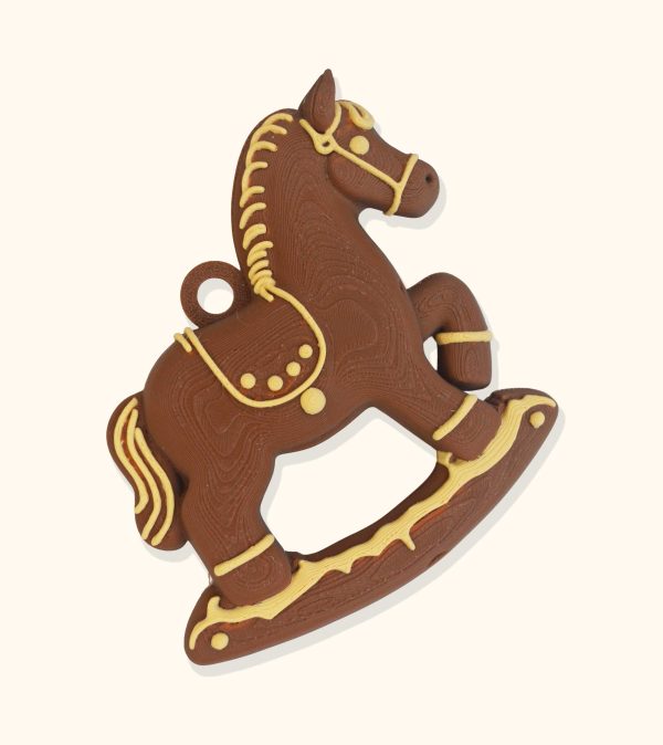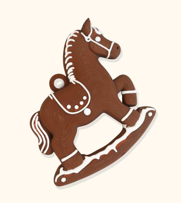 Декоративные элементы — уздечка, седло и контурные линии — напечатаны вторым цветом почти с самого начала процесса, что обеспечивает точность и выразительность. У модели характерная фактура, напоминающая имбирное печенье или резное праздничное украшение.