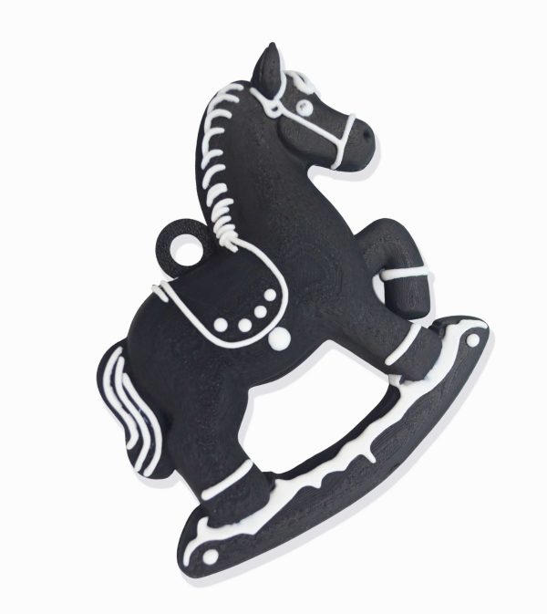 Объёмная ёлочная игрушка в виде лошадки-качалки, выполненная в технике двухцветной 3D-печати. Фронтальная и обратная стороны одинаково проработаны: игрушка состоит из двух напечатанных половин, которые аккуратно соединяются вручную. Благодаря этому изделие выглядит цельным, имеет приятный объём и аккуратный рельеф по всей поверхности.